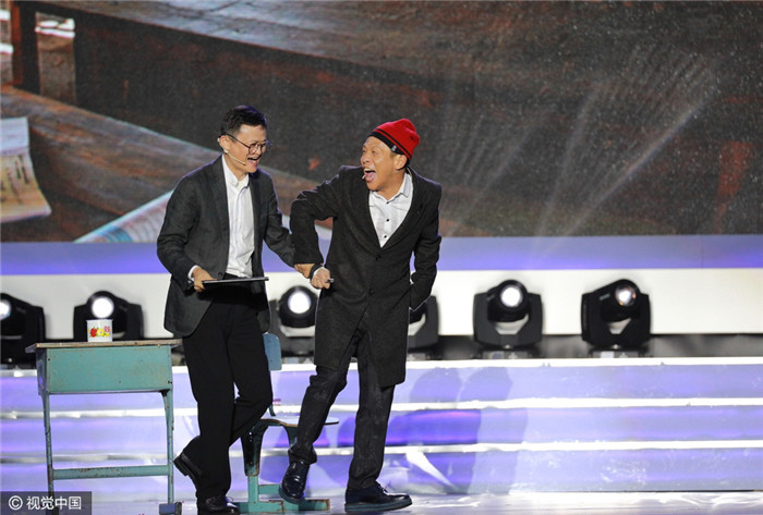 马云和宋小宝还一起表演了一个小品,宋小宝伸手对马云“一通指教”,马云则乖乖“听讲”。
